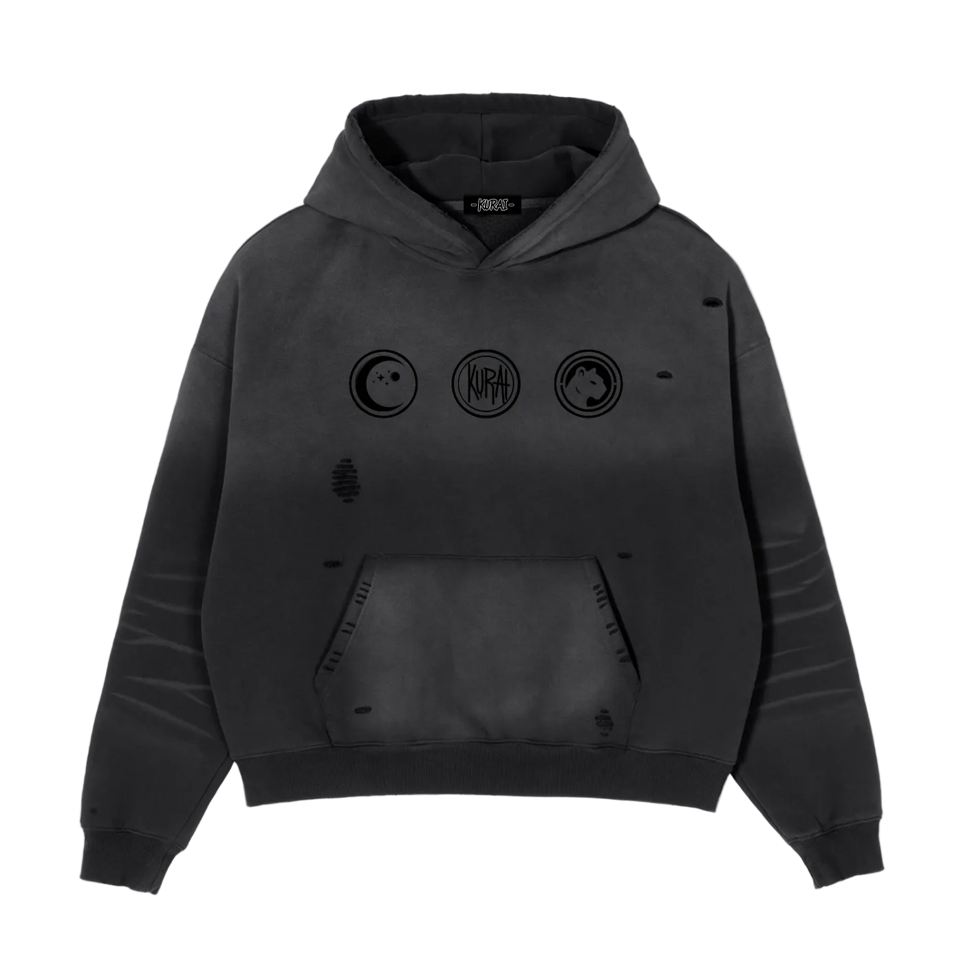 KURAI 3 LOGO BOXY FRAYED SUNFADE HOODIE (400gsm)